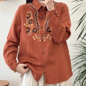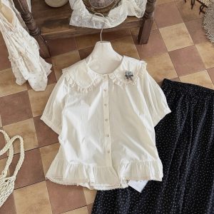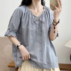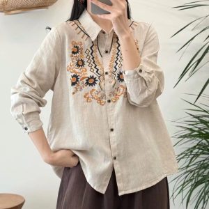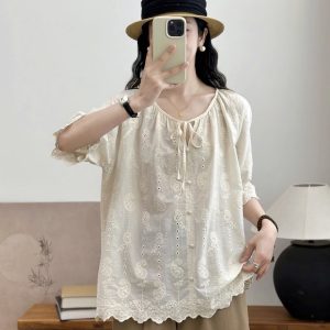 Áo somi thô cộc tay cổ đính hoa len