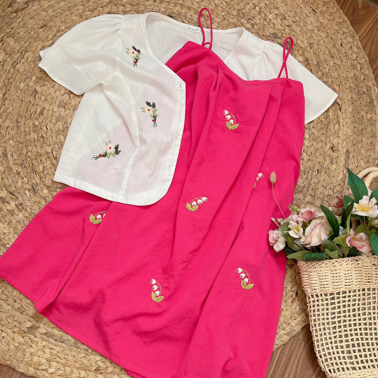 1. Chất liệu: Vải linen thun ít nhăn, thêu tay mặt trước (có lót bên trong)